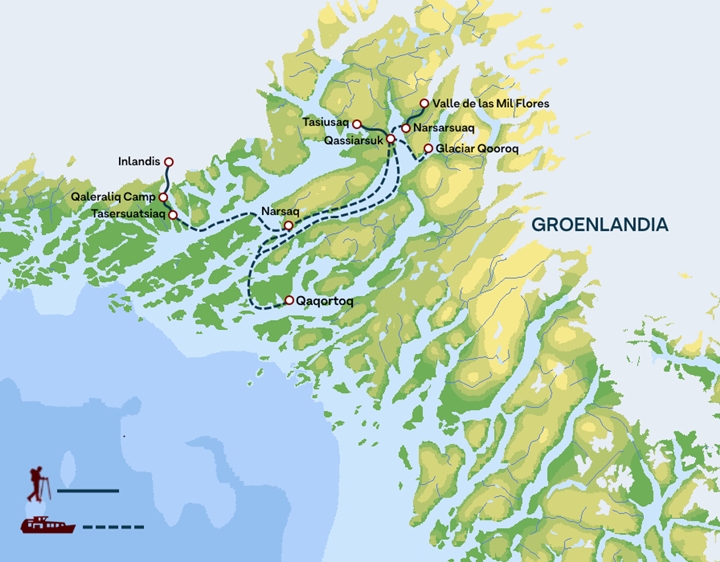 La ruta permite al viajero disfrutar del sur de Groenlandia a través de visitas culturales a las principales ciudades y pueblos inuit así como de actividades físicas tales como etapas de senderismo, una exclusiva caminata por el hielo, una excursión opcional de kayak, etc. Se admirarán paisajes espectaculares de montañas, tundra y glaciares, así como fiordos repletos de icebergs de diferentes tamaños. Esto sin olvidarse de la emocionante navegación por los fiordos a bordo de nuestras embarcaciones semirrígidas, que nos acercarán a algunos de los frentes glaciares más impactantes y extensos del sur de Groenlandia.