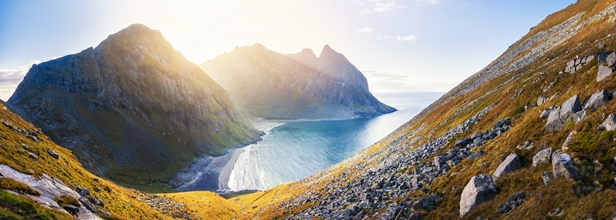 Seguiremos la ruta parando en el emblemático puente de Hamnoy. Avanzando entre islotes, playas blancas y pintorescos secaderos de bacalao llegamos a las proximidades de Fredvang, donde nos espera el trekking de Ryten/Kvalvika o “Playa de las Ballenas”. Este es uno de los lugares más aislados e impresionantes de Lofoten: playas vírgenes, acantilados verticales de granito negro, mar entre esmeralda y turquesa.