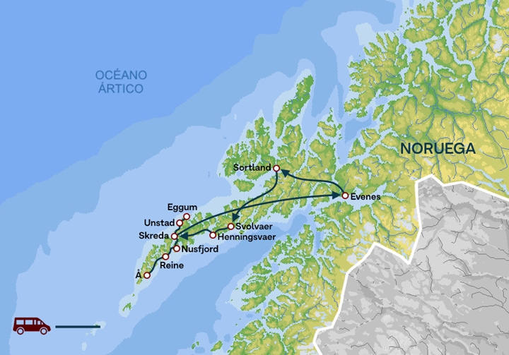 - El itinerario atraviesa distintos ecosistemas, desde zonas boscosas hasta tundra, con posibilidad de observar fauna ártica como alces en la zona de Evenes y renos en el marco de una experiencia cultural Sami.