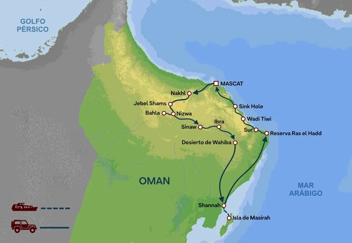 En caso de marea alta o temporal que suponga peligro para las embarcaciones y ferris la autoridad costera puede ordenar que se suspenda el tráfico. Si esto ocurriera y no hubiera alternativa para llegar a la isla en el día previsto se modificaría el programa y se haría noche en la costa sustituyendo las visitas de la Isla de Masirah por otras de interes histórico y/o natural en la costa.