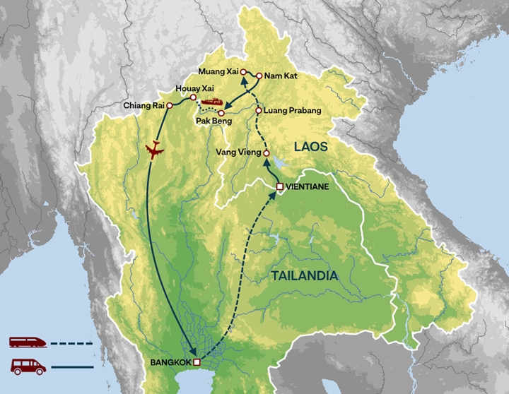 De Tailandia a Laos y de nuevo a Tailandia, nos esperan palacios legendarios, animados mercados locales, encantadoras ciudades coloniales o espacios naturales de gran belleza, así como los templos más emblemáticos de ambos países, auténticos centros espirituales y culturales de una gente que tiene en la sonrisa uno de los principales valores compartidos del sudeste asiático.