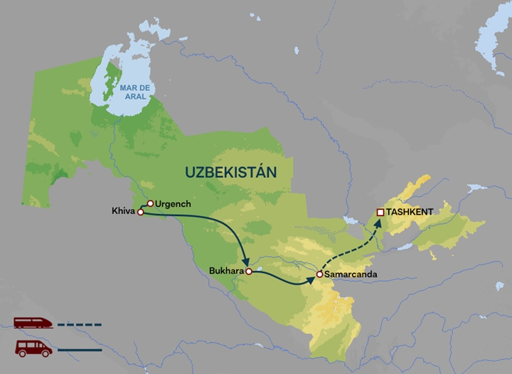 El itinerario podría verse sujeto a modificaciones en caso de cambios en la operativa por parte de Uzbekistan Railways (horarios y días de operación de los trenes). Según la disponibilidad en el momento de la reserva, el trayecto podrá realizarse en tren de alta velocidad Afrosiab, en tren expreso Sharq o, alternativamente, en vehículo por carretera (310 km / 5'30 hrs).