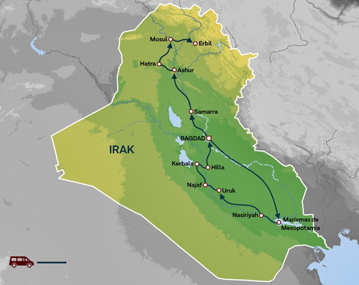 Nos adentraremos en lugares emblemáticos de la historia, como las antiguas poblaciones de Ur y Uruk, la histórica capital Samarra y reservas naturales únicas como las marismas de Mesopotamia, hogar de una cultura milenaria.
