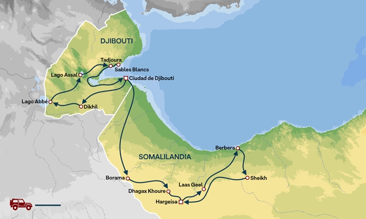 Desde los paisajes surrealistas del lago Abbé y las aguas del lago Assal hasta el histórico puerto de Tadjourah y las playas de Sables Blancs, el recorrido nos lleva por escenarios de una belleza inesperada. Al cruzar a Somalilandia, exploraremos Borama y Hargeisa, visitaremos un santuario de guepardos y las pinturas rupestres de Laas Geel, antes de terminar frente al Mar Rojo. Una aventura fascinante por dos territorios poco conocidos y llenos de autenticidad.