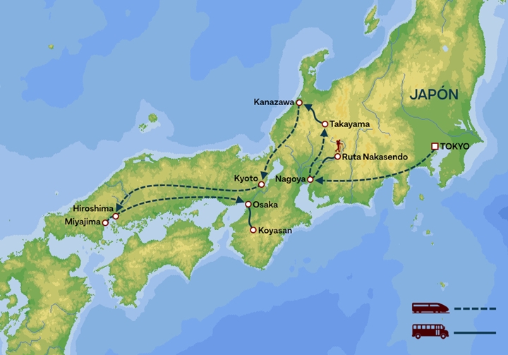 La ruta está diseñada para realizar un viaje aprovechando al máximo el tiempo y seleccionando las visitas incluidas, en que el viajero tenga tiempo a su aire para visitas opcionales, caminatas, etc. Las visitas recomendadas en los días libres son fáciles de realizar con nuestro Japan Rail Pass y no implican ningún cargo extra a excepción de los lugares a visitar. De todas formas, podemos organizar estas visitas guiadas en transporte privado.