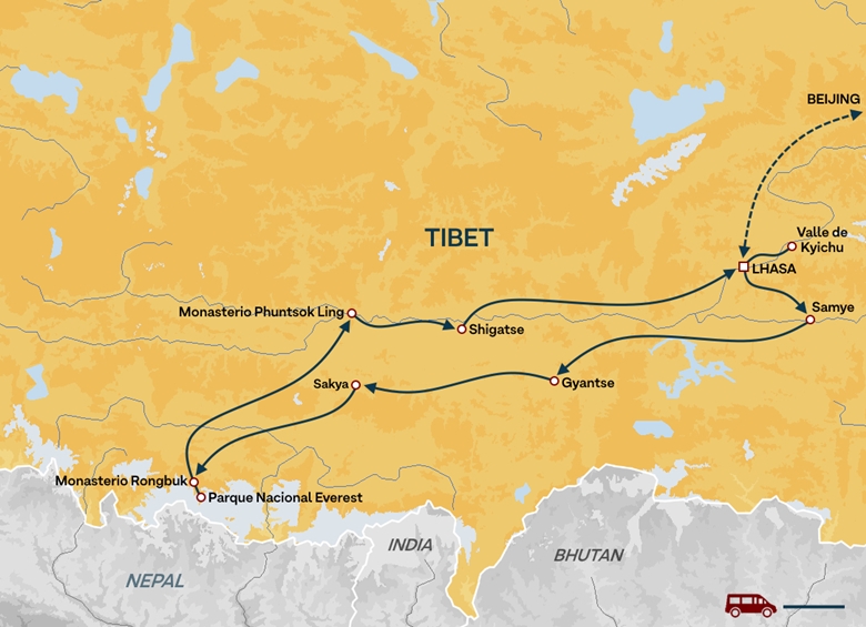 - Transporte en vehículo privado, tamaño según grupo, con aire acondicionado, durante el recorrido en Tíbet.