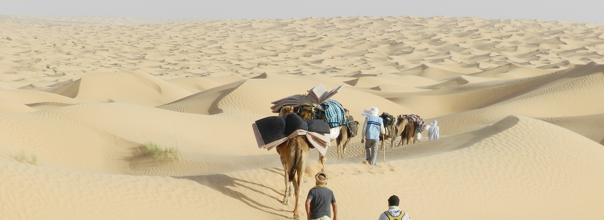 Desplazarnos a pie por el Erg Oriental de Túnez nos permite viajar en el tiempo y recuperar el ritmo de viaje de las antiguas caravanas. Caminar en compañía de nuestros dromedarios y preparar cada día el pan con las brasas sobre la arena en nuestro campamento nos permite recuperar nuestro ritmo vital olvidado.