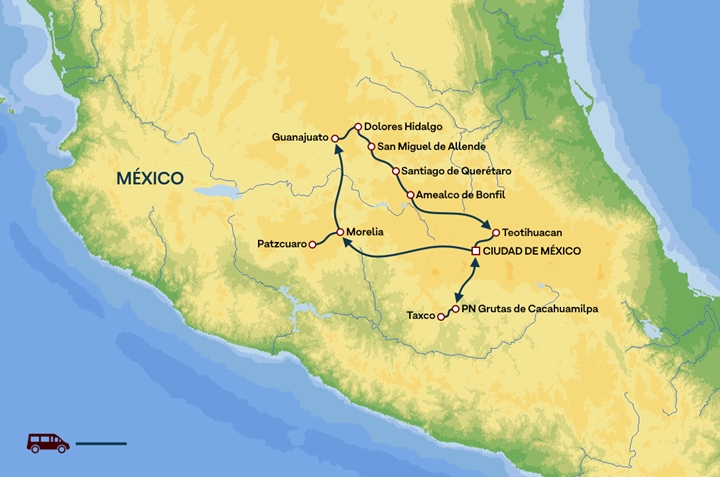 | 8 | Guanajuato - Dolores Hidalgo - San Miguel de Allende | D | Hotel |