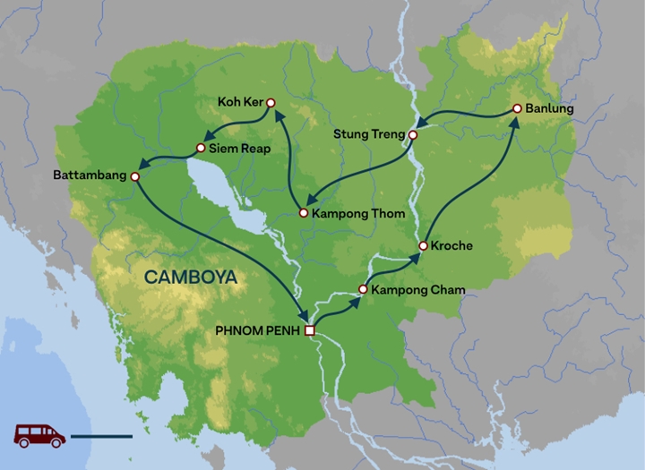 Existe la posibilidad de finalizar el viaje en Siem Reap. En ese caso, se incluirá un traslado por carretera en vehículo privado, únicamente con conductor, desde Battambang hasta Siem Reap.