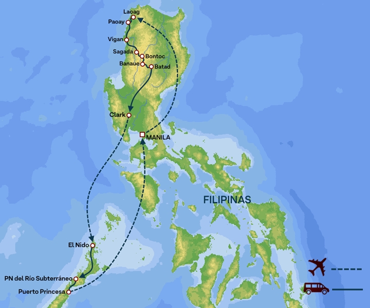 Esta ruta nos ayudará a descubrir de manera relajada un país repleto de contrastes y gente amable. Conoceremos el pasado colonial de Manila y Vigan; caminaremos entre milenarios arrozales del pueblo Ifugao; observaremos los rituales fúnebres de la cultura Igorot; y nos asombraremos con los paisajes de la isla de Palawan.