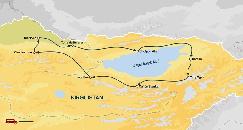 Durante la ruta se visitan el lago Issyk-Kul, a 1.600 m de altitud, los tradicionales campamentos nómadas con sus yurtas y las aguas termales de Cholpon Ata y Karakol, ideales para relajarse en los días más fríos.