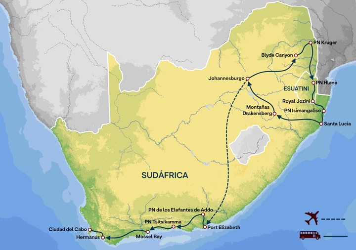 Nuestro itinerario es mucho más que fauna: es la cultura, belleza y arquitectura colonial de Ciudad del Cabo y Johannesburgo, las impresionantes vistas del cañón del río Blyde (el segundo más largo de África), la inmensidad de las montañas Drakensberg, los más bellos escenarios de costa salvaje en el PN Tsitsikamma, Knysna y cabo de Buena Esperanza y el punto más meridional de Africa: el Cabo Agulhas. Una ruta para aquellos viajeros que buscan una genuina aventura africana, combinada con la fascinación de inmejorables parques nacionales, multitud de emocionantes actividades, paisajes increíbles y la comodidad de buenos alojamientos en ruta.